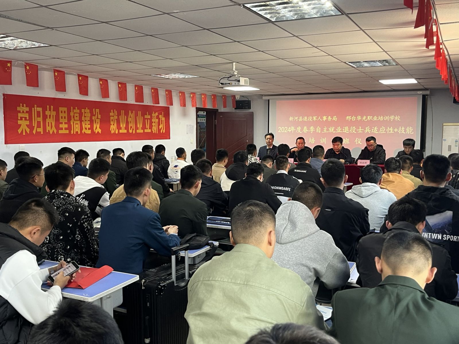2024年3月20日上午在邢台华光学校隆重举行邢台市“威县、柏乡、任泽、新河”四县区2024年春季自主就业退役士兵“适应性+技能”培训开班仪式。威县退役军人事务局局长王保勇代表四县区退役军人事务局参加仪式并做重要讲话,学校领导、教师代表、优秀退役士兵代表分别做表态发言。参会人员有区县相关部门领导、相关负责人以及2024年春季退役士兵参加培训活动,共有90余人参加了开班仪式。